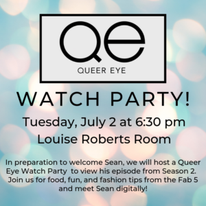 In preparation to welcome Sean, we will host a Queer Eye Watch Party on Tuesday, July 2 at 6:30 pm in the Louise Roberts Room to view his episode from Season 2.  Join us for food, fun, and fashion tips from the Fab 5 and meet Sean digitally!